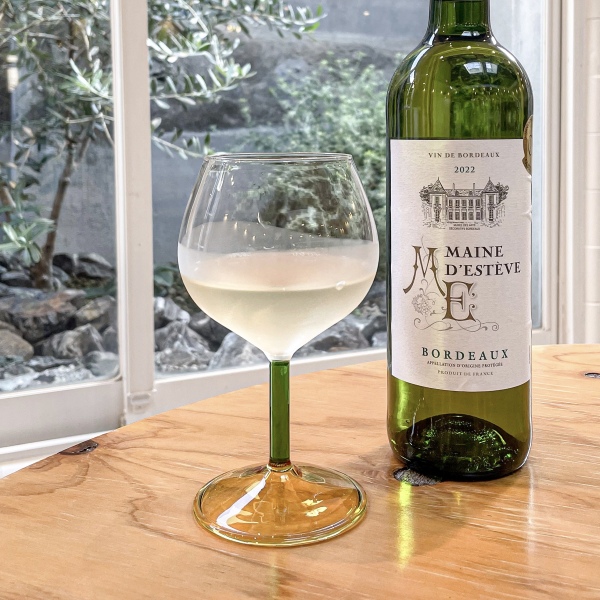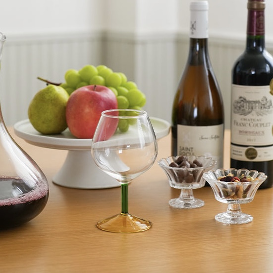 ツートーンカラーのアクセントがおしゃれなワイングラスと、ボトルワインをセットにしました。